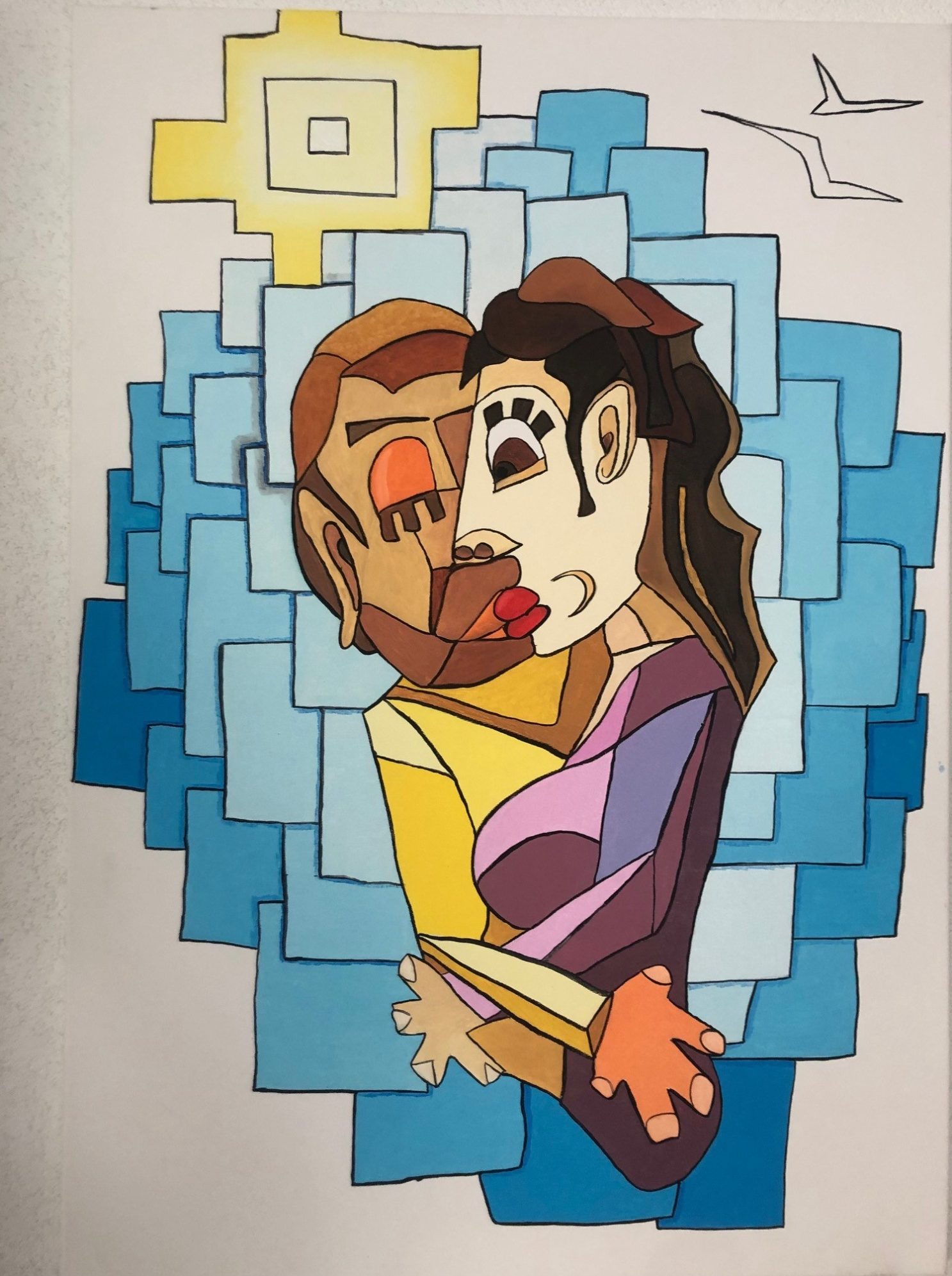 Das Werk erzählt von Nähe und Verschmelzung, von der Kraft der Liebe, die einen Raum erhellt, ohne ihn zu dominieren. Die geometrische Ordnung des Himmels und die kubistische Darstellung der Figuren stehen im Spannungsfeld zwischen Struktur und Gefühl. Die Liebe scheint hier als vibrierende Energie, begrenzt im Raum, aber grenzenlos in ihrer Wirkung.