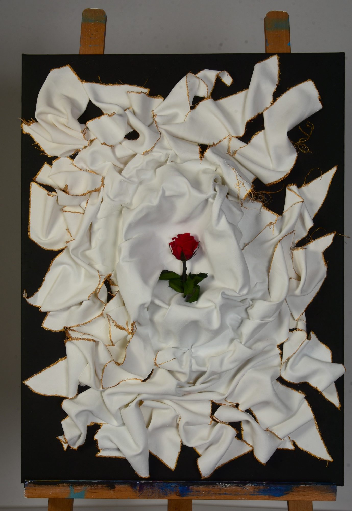 Die Ränder des Stoffes sind mit Gold akzentuiert, ein Kontrast zur Zerrissenheit, ein Zeichen von Wert und Würde. Die schwarze Leinwand im Hintergrund bleibt leer, aber nicht bedeutungslos. Sie ist Raum für Möglichkeit, für das, was noch erscheinen kann. Das Bild wirkt wie ein Schutzschild, das sich zwischen Betrachter und Tiefe stellt, nicht um zu verbergen, sondern um zu bewahren.