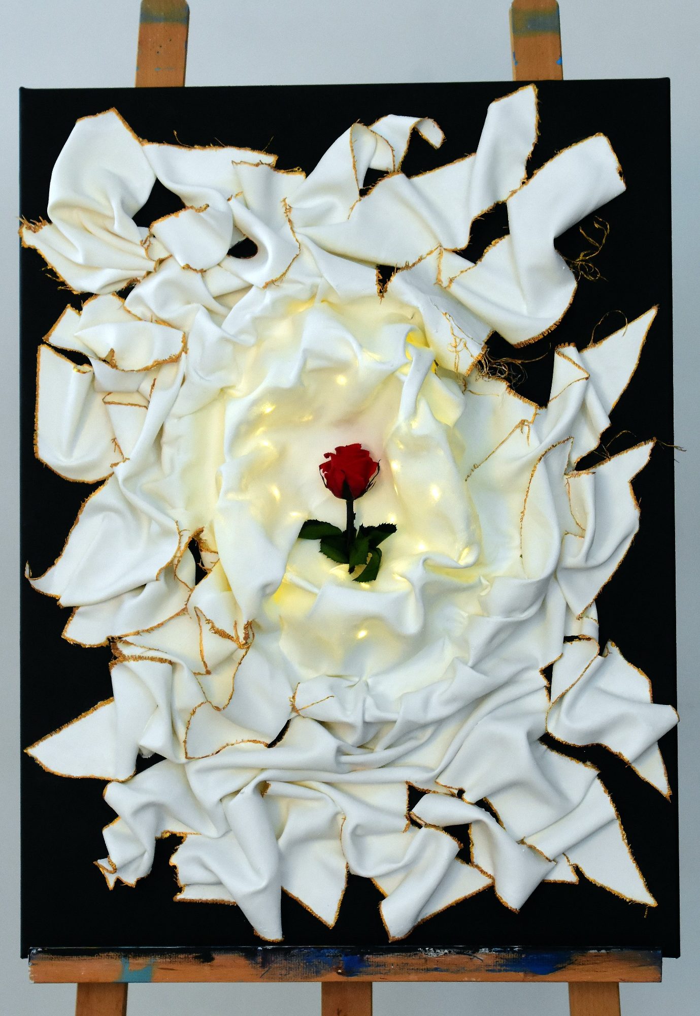 Inmitten dieser Vertiefung liegt eine echte gefrorene rote Rose, eingefasst in Licht, das hinter dem Stoff pulsiert. Die Beleuchtung scheint zu atmen, als würde das Bild selbst leben. Die Rose ist nicht nur Objekt, sondern Symbol: für Vergänglichkeit, für Schönheit im Zerfall, für das Herz des Bildes, das sich nicht versteckt, sondern geschützt wird.
