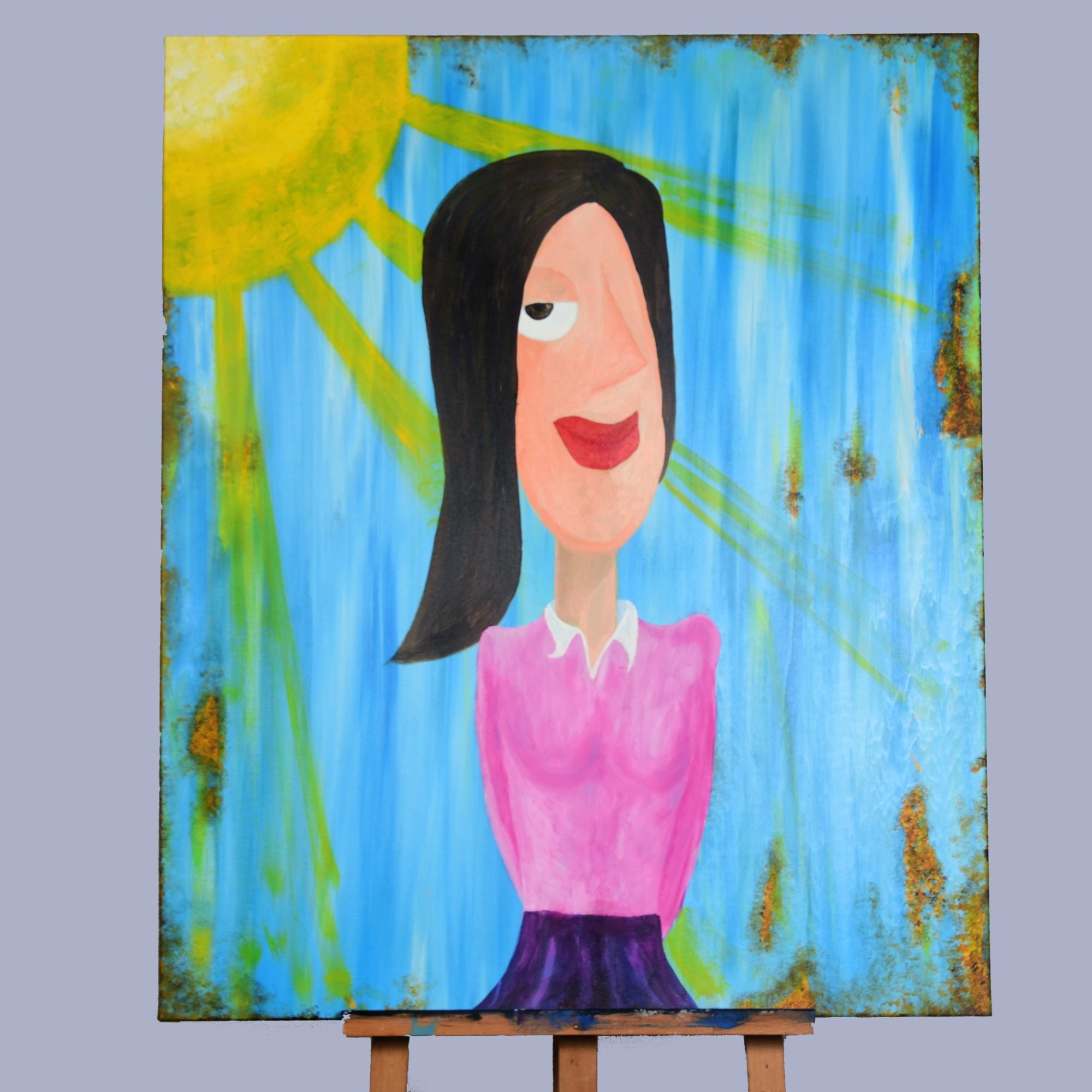 Der Hintergrund ist durchzogen von blauen Streifen, durchsetzt mit rostfarbenen und grünen Texturen, wie eine Wand, die zugleich Himmel und Geschichte ist. Links oben strahlt eine Sonne mit gelben Strahlen, ein Licht, das nicht nur wärmt, sondern durchdringt. Es ist kein realistisches Licht, sondern ein inneres Leuchten, das die Szene durchzieht.