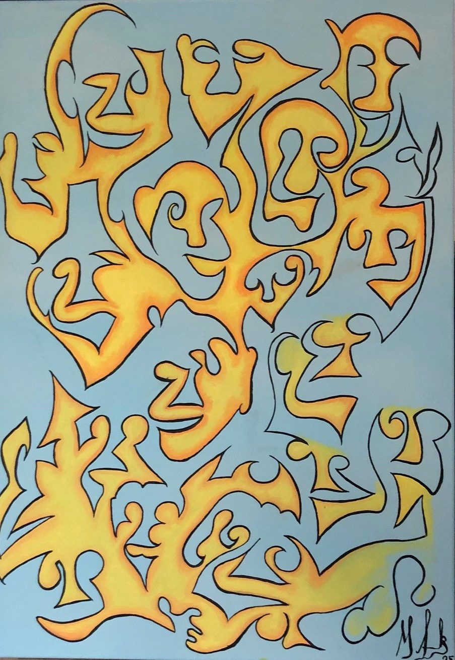 „Vielfalt der Gesichter“ ist ein Bild über Verbindung und Individualität. Die durchgehende Linie steht für das Gemeinsame, das uns alle durchzieht, während die Formen und Farben die Einzigartigkeit jedes Wesens feiern.